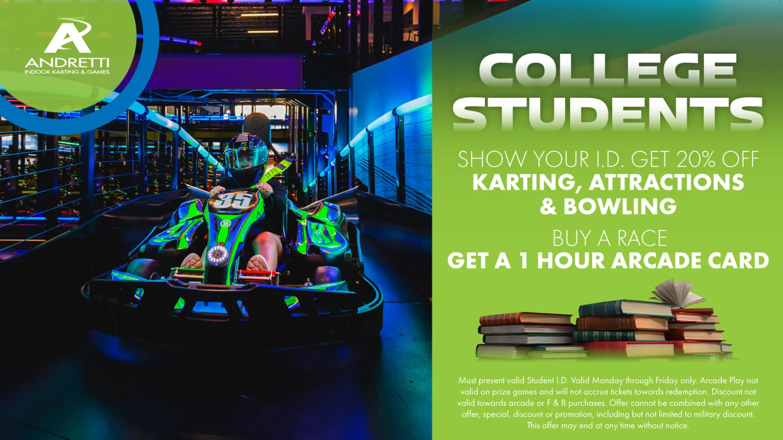 Andretti Indoor Karting & Games is proud to offer College Students special perks: